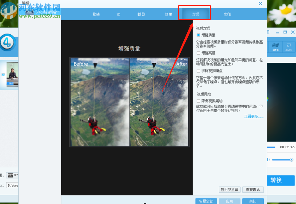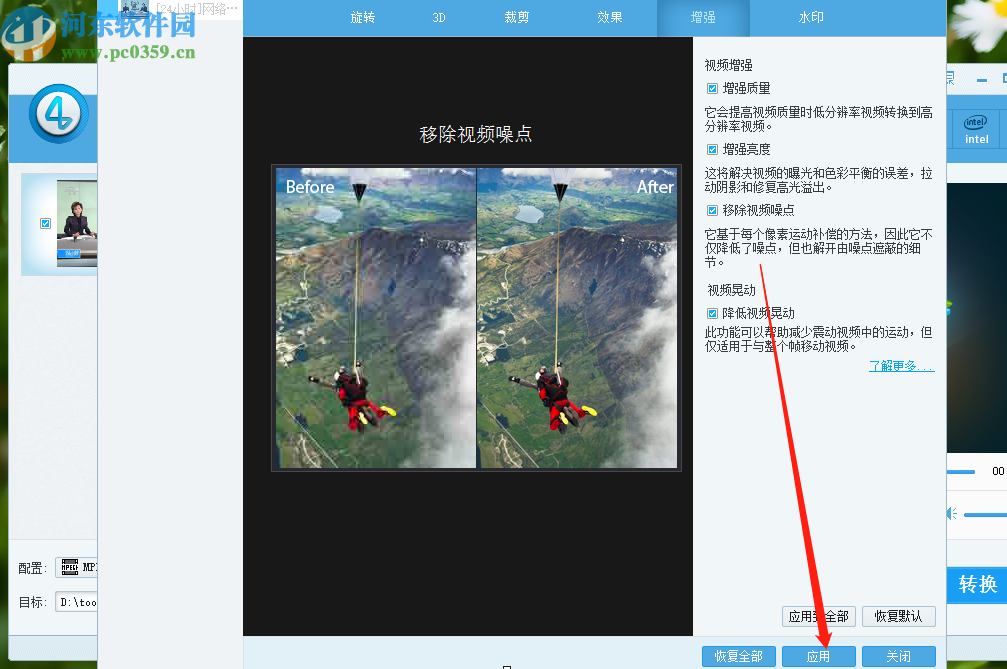 5.点击增强这个模块之后我们可以勾选视频增强、增强亮度、降噪、降低视频晃动这些选项,根据视频的具体需求进行勾选之后点击应用按钮。