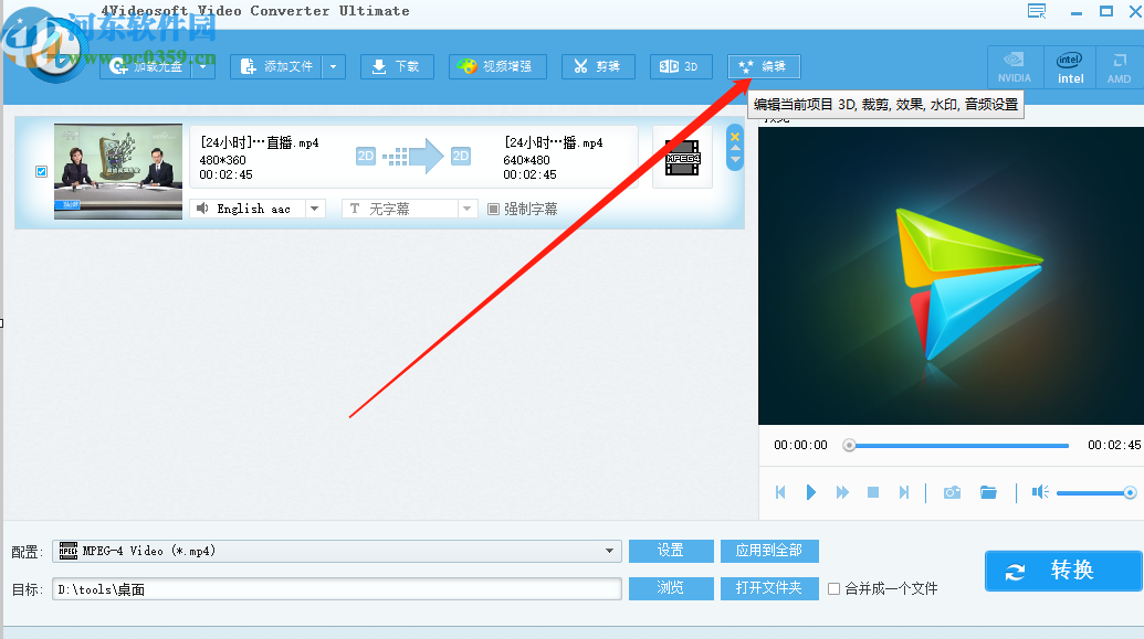 3.点击打开按钮之后在软件的主界面中我们点击右上角的编辑这个功能按钮进入到视频的编辑界面。