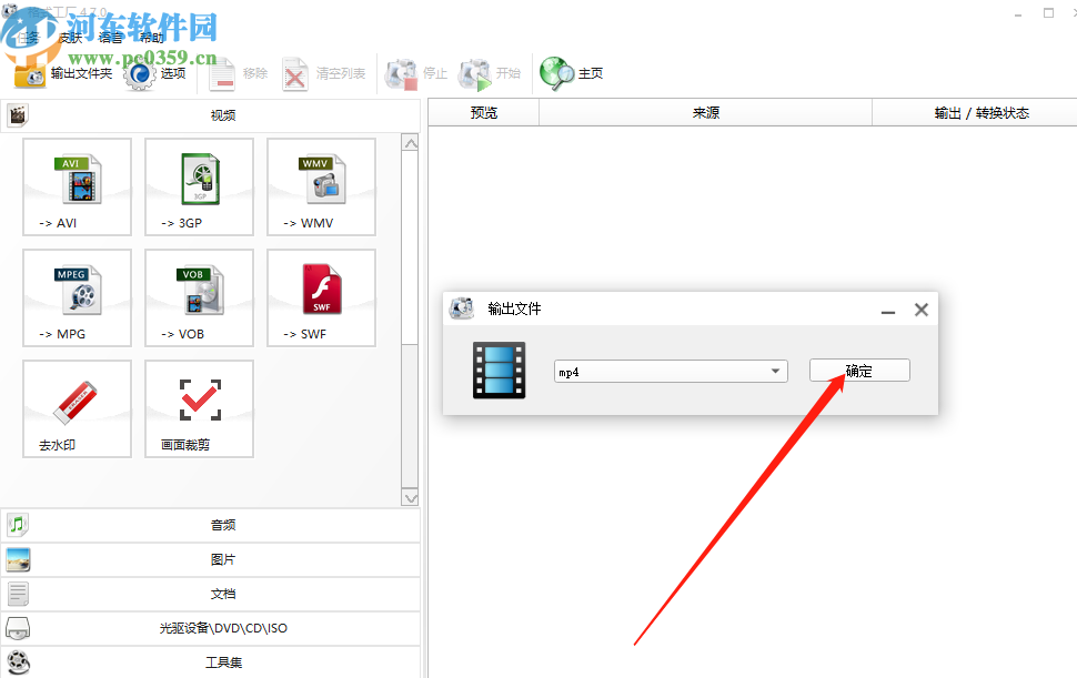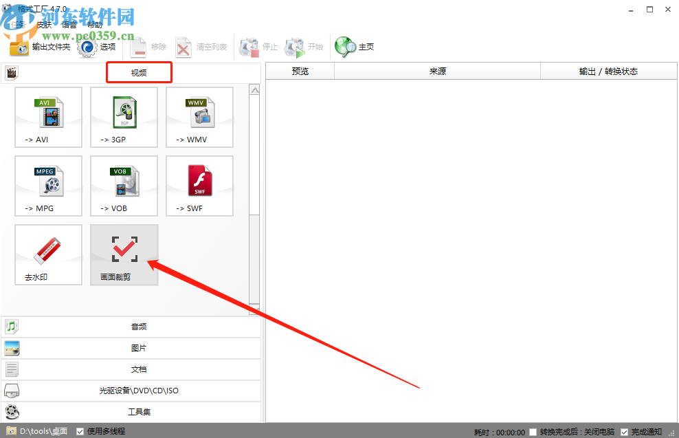 2.点击进入到画面裁剪功能图标之后,我们会看到一个输出文件格式选择的窗口,在这个窗口中选择自己想要的输出格式。