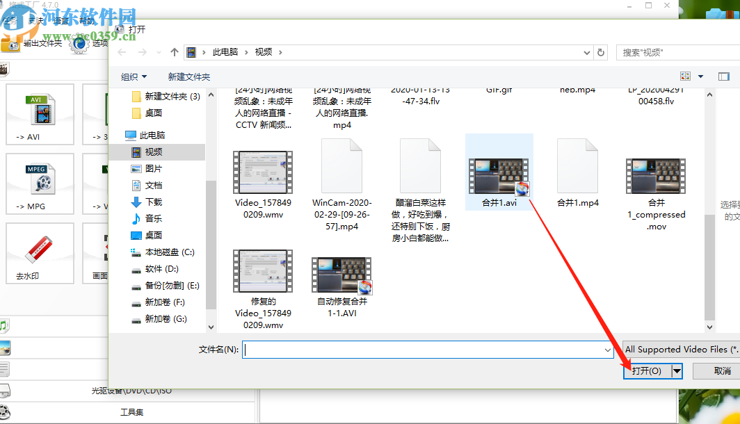 3.选择好输出格式之后就会出现选择想要裁剪的视频界面,在这个界面中我们选中目标视频之后点击右下角的打开按钮。