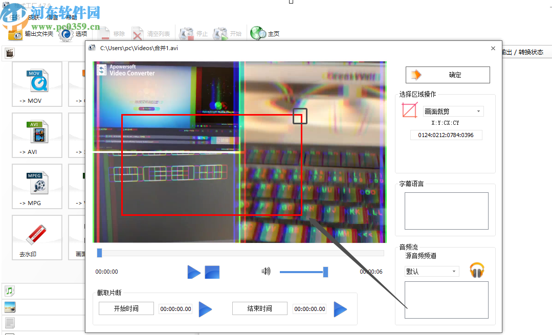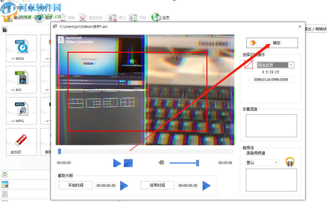 4.点击打开按钮我们就会进入到裁剪视频尺寸的操作,界面中会有一个红色的选框,这个选框可以调整大小和位置,就是用来选择裁剪所要区域的。