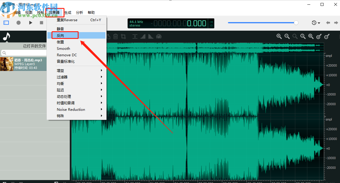 3.点击打开按钮之后下一步我们在界面上方的操作界面中选择效果器选项,选择之后在出现的选项中点击反向这个功能。