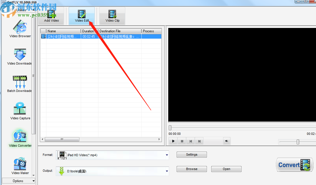 3.点击打开按钮之后视频就成功添加到软件界面中了,然后我们在界面上方点击Video Edit这个功能按钮,进入到视频编辑功能界面。
