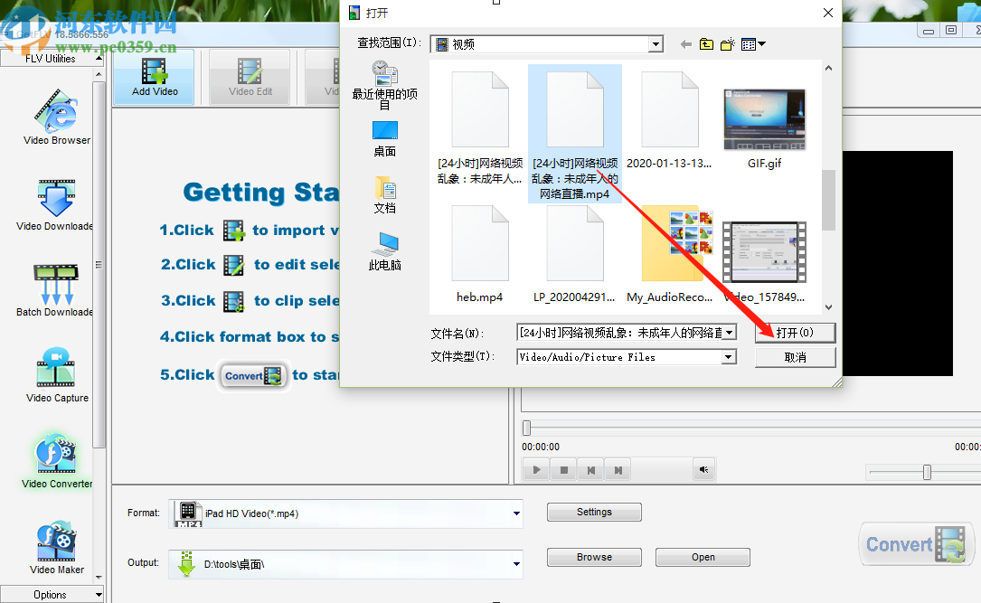 2.点击添加视频按钮之后下一步会出现一个选择文件的界面,在这个界面中我们选中目标视频文件之后点击右下角的打开按钮即可。