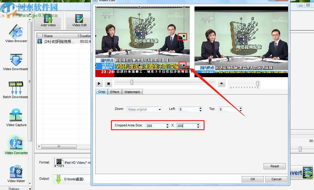 4.进入到视频编辑功能界面之后,我们可以调整视频中的裁剪框,选择想要裁剪的位置,另外可以在下方直接输入想要裁剪视频的尺寸。