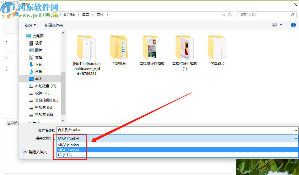 5.点击合并按钮之后会出现一个保存文件的界面,在保存类型这个下拉列表中我们可以设置合并之后的视频文件格式。