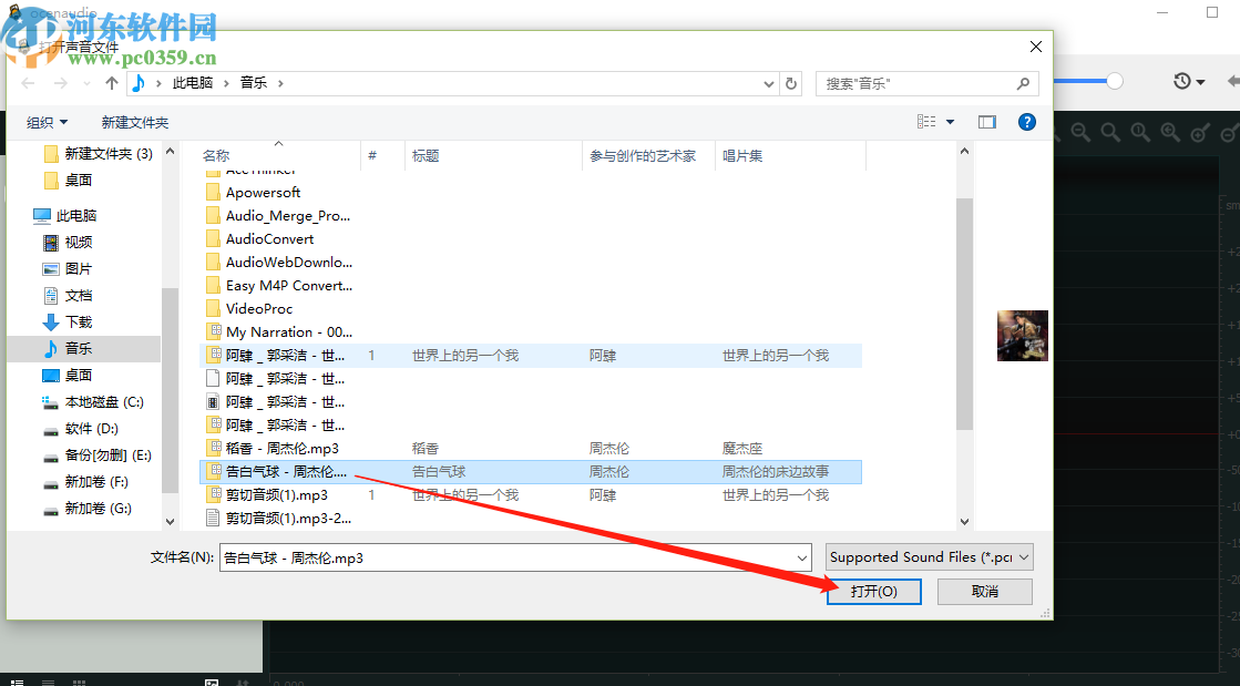 2.点击打开选项之后,下一步我们在出现的选择文件界面中,选中目标音频文件之后点击右下角的打开按钮即可。