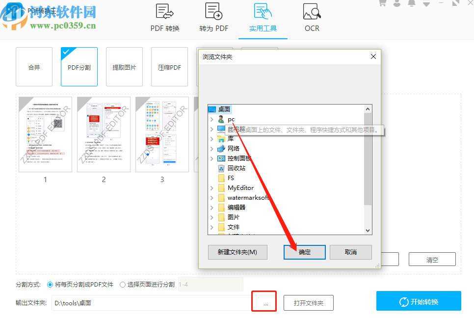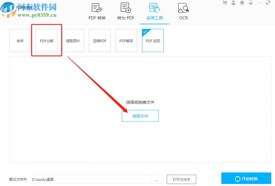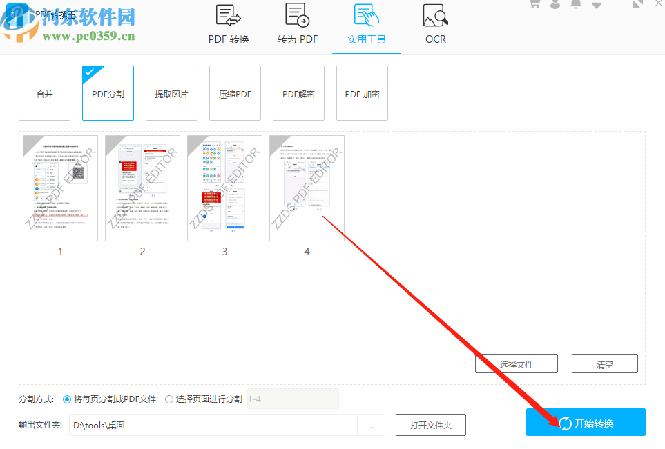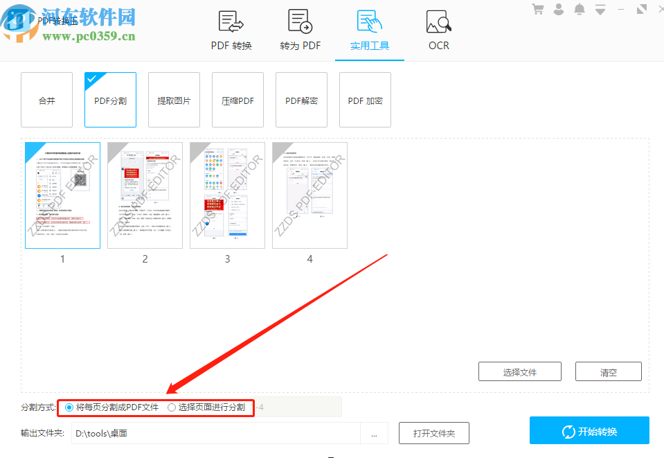 6.最后我们设置好文件输出文件夹之后,点击界面右下角的开始转换按钮就可以开始分割PDF文件的操作了。