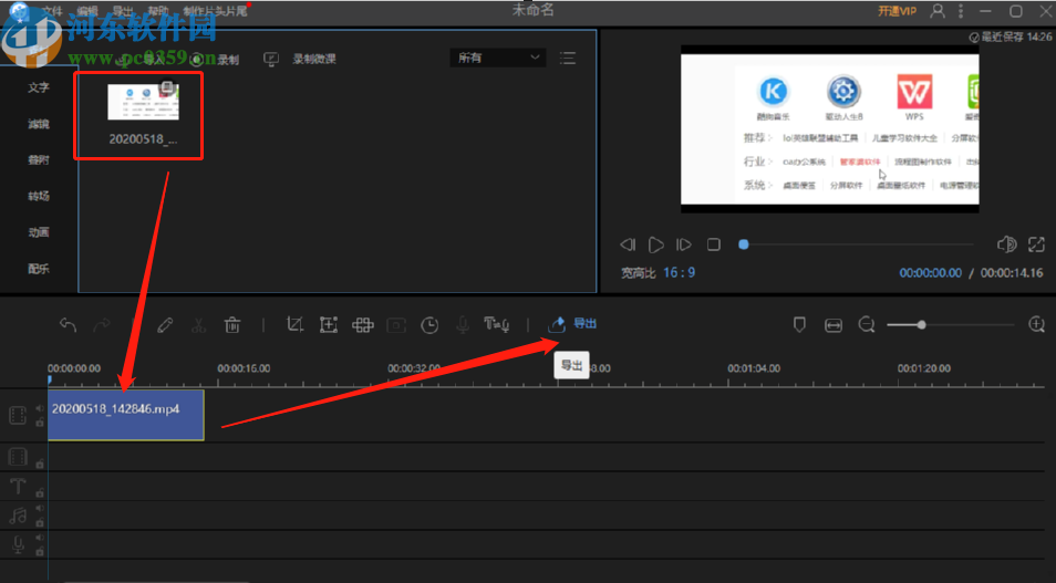 6.停止录制之后录制的视频会直接出现在视频编辑王的主界面,将它拖动到下方的编辑操作台上面之后即可进行编辑操作,编辑完成之后点击导出按钮即可保存这个录制的视频。
