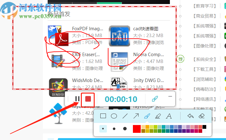 5.开始录制之后点击画笔图标可以在录制界面进行涂鸦,想要录制的内容都录制完成之后,点击界面中红色的正方形图标即可停止录制。