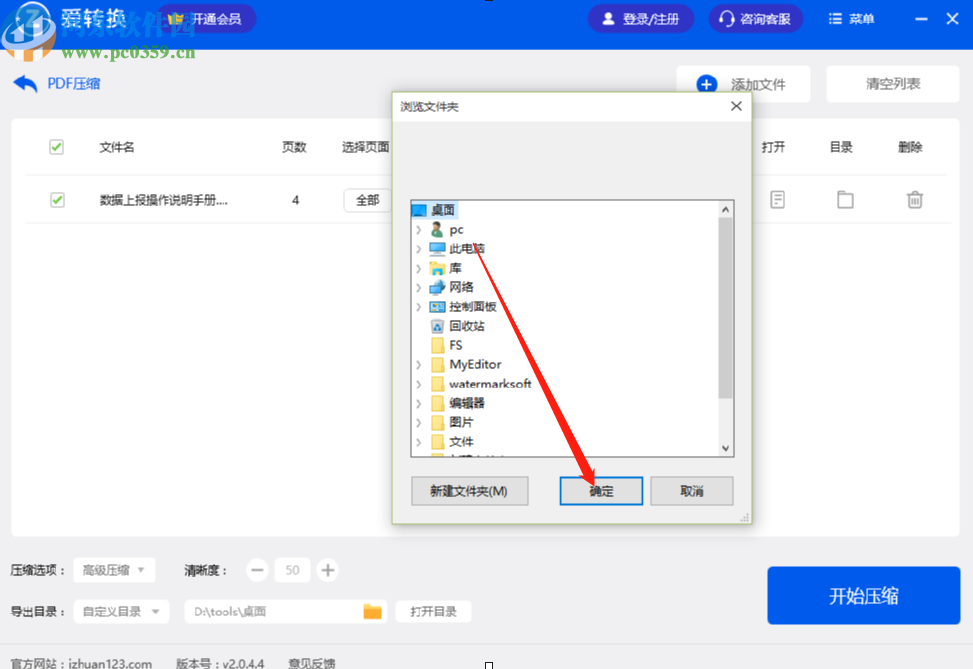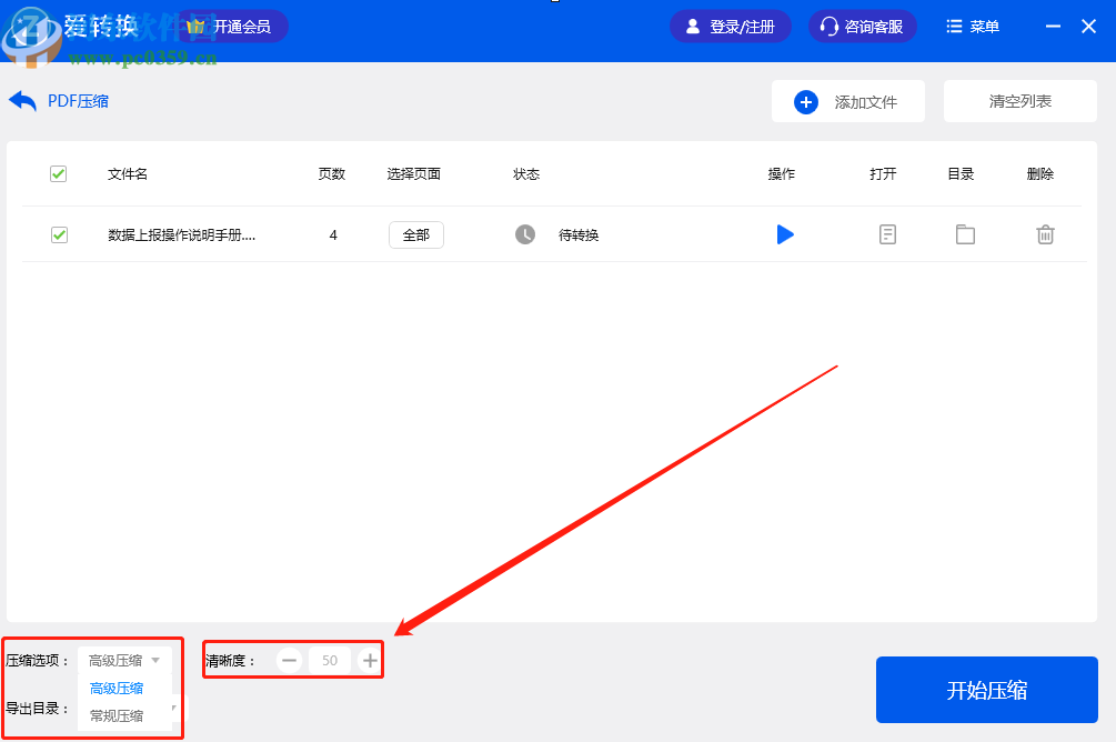 4.将想要压缩的PDF文件添加进来之后,下一步在界面左下方找到压缩选项,点击打开之后可以选择压缩选项,同时还可以设置清晰度。