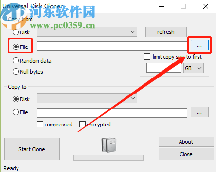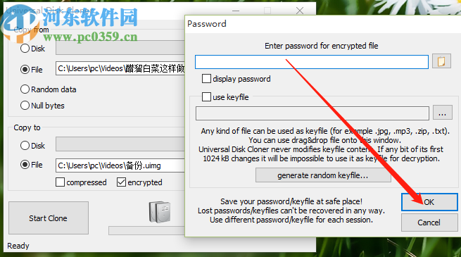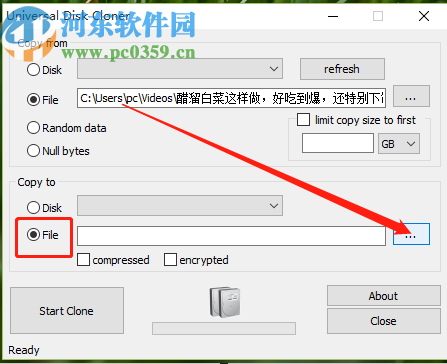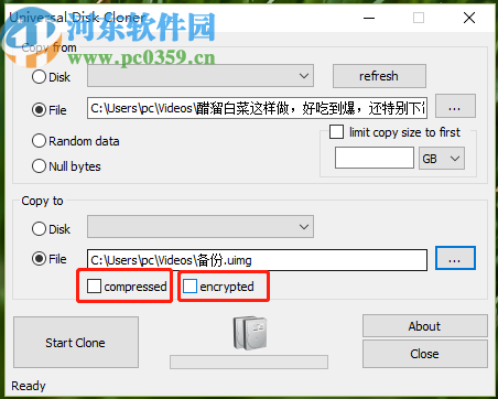 5.设置好被克隆的文件路径和保存克隆文件的路径之后,在界面中可以看到有copressed和encrypted这两个选项,分别是压缩和加密选项。