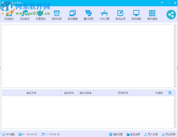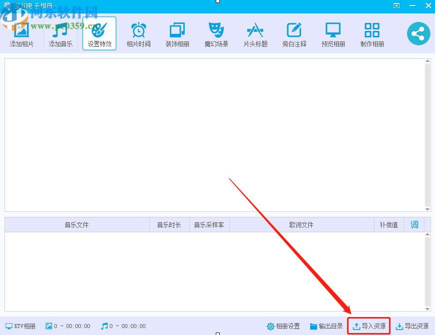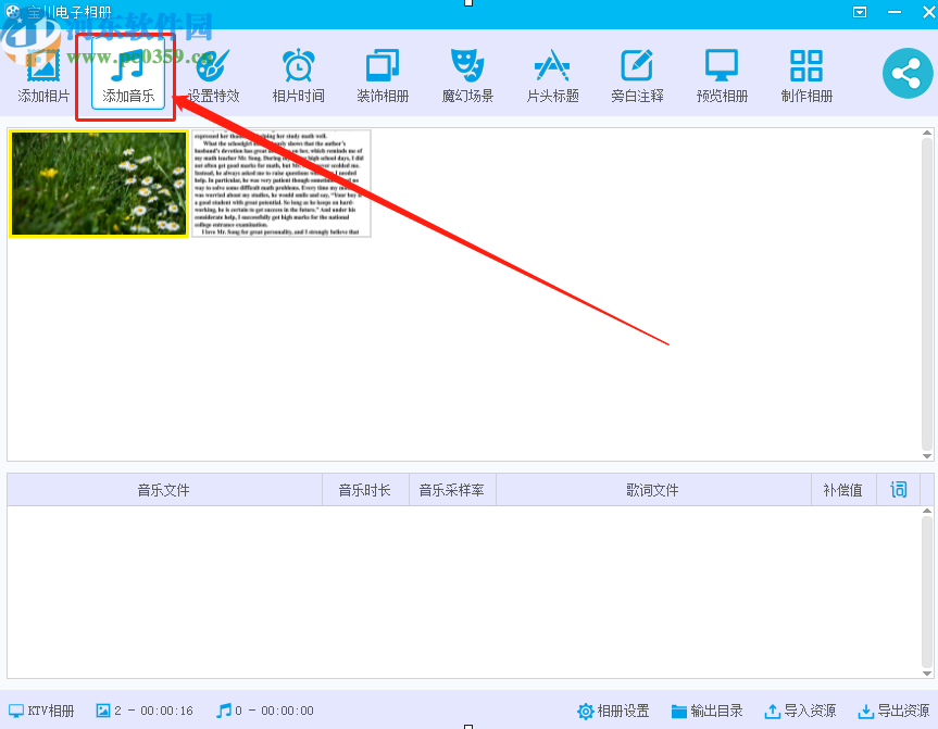 3.点击导入资源之后,软件就会自动识别到资源文件中的所有相册制作的参数数据了,如下图中所示,然后我们点击上方的添加音乐功能。