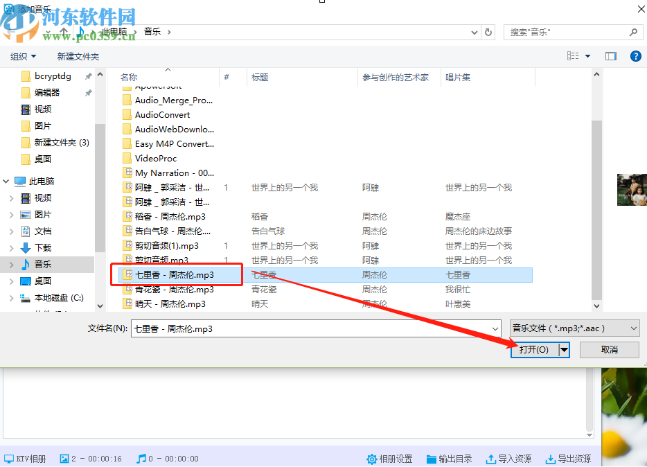 4.点击添加音乐之后会出现一个选择音乐文件的界面,在这个界面中选中想要添加的音乐之后点击右下角的打开按钮即可。