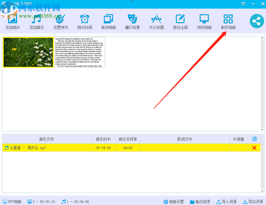 5.点击打开按钮之后我们选择的音乐就添加到相册制作界面了,然后我们点击界面右上角的制作相册按钮准备开始制作添加音乐后的相册。