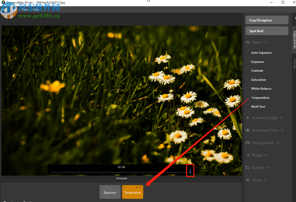 4.点击选择想要使用的特效之后,在界面下方就可以看到选择的特效按钮了,然后移动下图中框出的指针可以调整特效的强度,左右滑动进行调整。