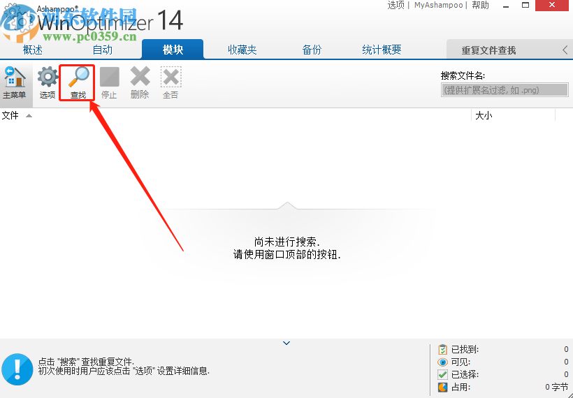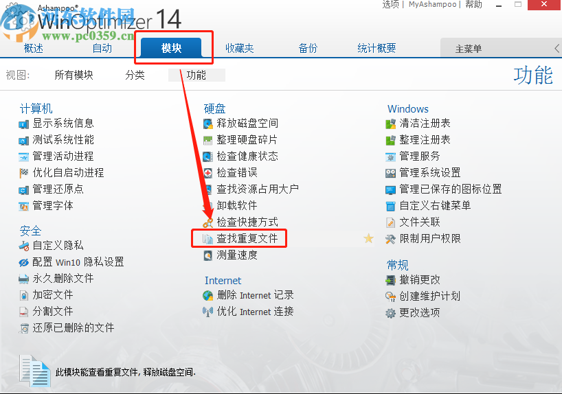 1.首先第一步我们打开软件之后点击上方的模块,切换到模块界面之后点击查找重复文件这个功能选项。