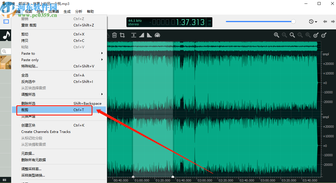 3.点击这个打开按钮将音频添加到软件之后,我们按住鼠标左键左右移动就可以在界面的音轨中选择想要裁剪下来的音频片段了,选取之后点击上方的编辑选项。