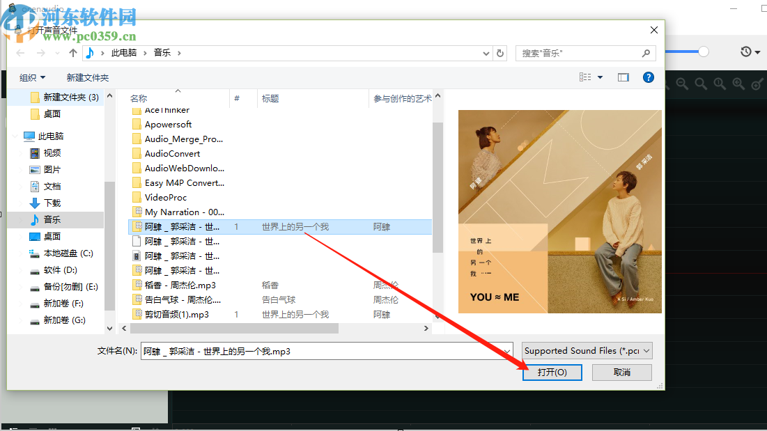 2.点击打开之后下一步我们在打开的选择文件界面中,选中目标音频文件之后点击右下角的打开按钮即可。