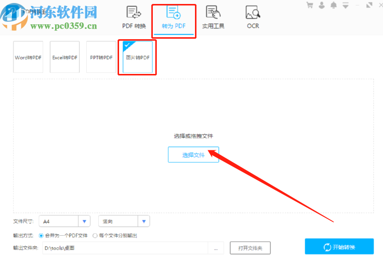 1.首先第一步我们打开软件之后,选中转为PDF功能模块,点击图片转PDF之后点击选择文件按钮。