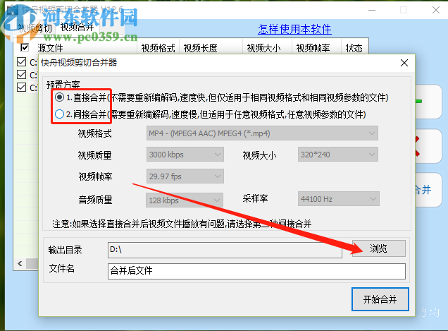 4.点击这个合并功能按钮之后,我们在出现的合并操作界面中需要选择合并的预置方案,有直接合并和间接合并两种方式,选择之后点击下方的浏览按钮。