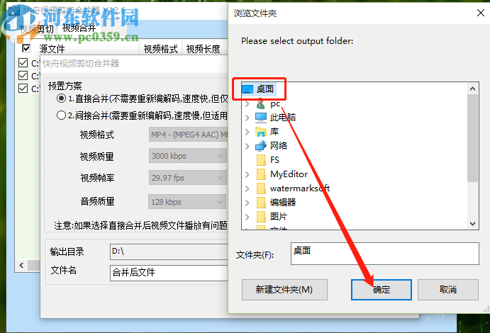 5.点击浏览按钮之后就会打开一个选择文件的界面了,在其中我们根据自己的需求选择想要保存合并的视频文件路径之后点击下方的确定按钮即可。
