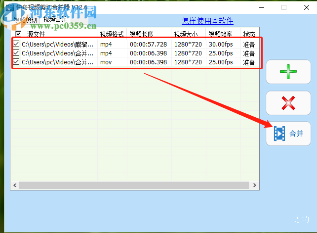 3.点击打开按钮之后选择的文件就成功添加到软件界面中了,接着我们点击界面右侧的合并这个功能按钮,如下图中所示。