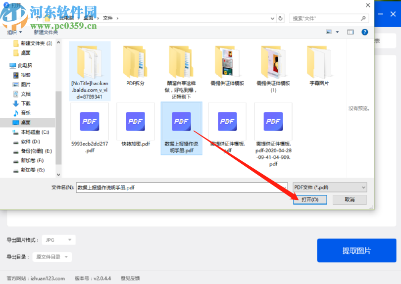 3.点击提取PDF文件之后接下来在打开的选择文件界面中,我们选择目标PDF文件之后点击右下角的打开按钮。