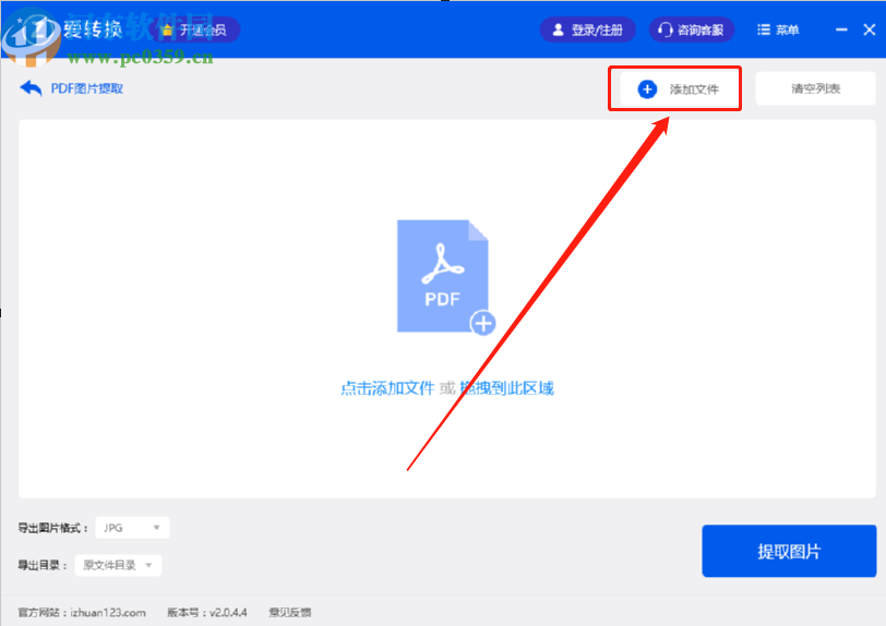2.进入到PDF文件提取功能界面之后,我们点击界面中的添加文件这个功能按钮,点击准备添加想要提取图片的PDF文件。