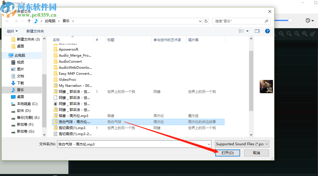 2.点击打开选项之后下一步在出现的界面中就可以选择音频文件了,选中自己想要编辑处理的音频之后点击右下角的打开按钮。