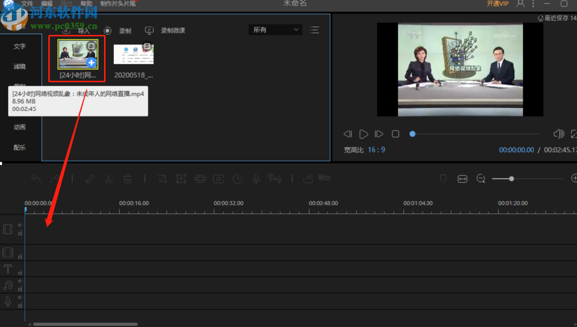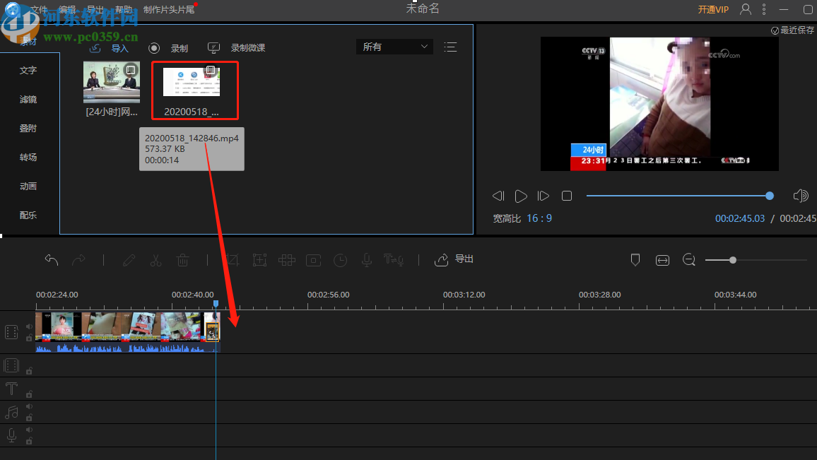 3.点击将视频添加到软件界面之后,我们点击选中需要衔接的前一个视频,拖动到下方的操作台中。