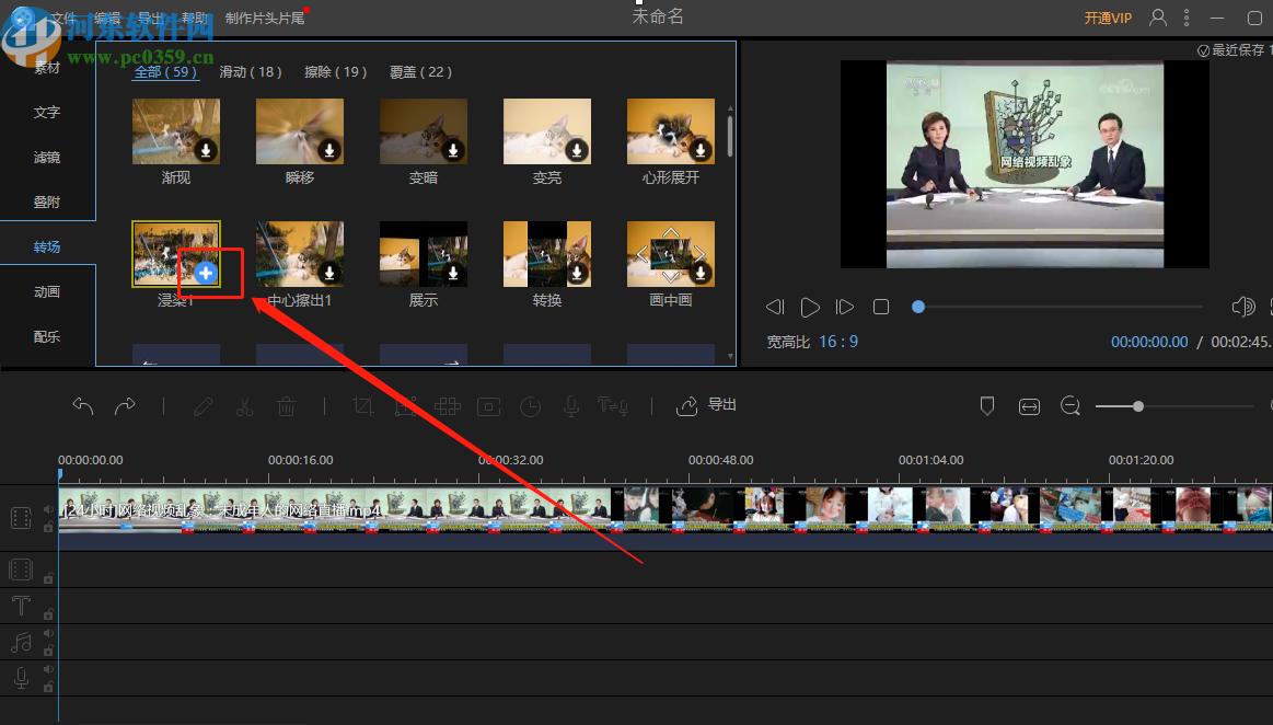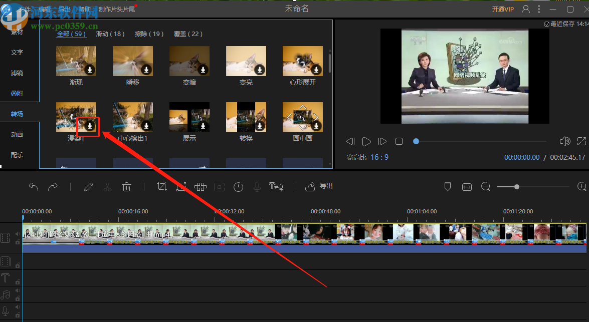 4.之后下一步我们在界面左上方选择转场功能,然后在转场素材中选择一个自己想要使用的转场效果,点击下载按钮将它下载下来。