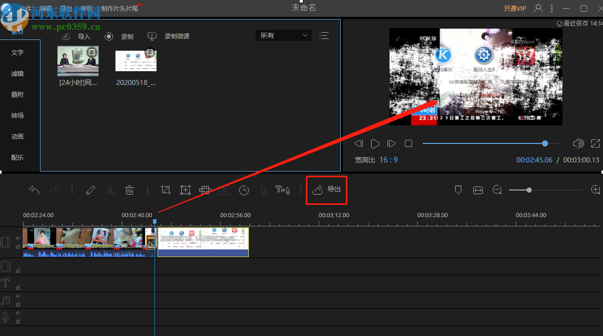 7.两个视频都添加完成之后,我们移动视频中的指针,在两个视频衔接的位置就可以看到添加转场的效果了,满意的话点击界面中的导出按钮即可将视频导出保存。