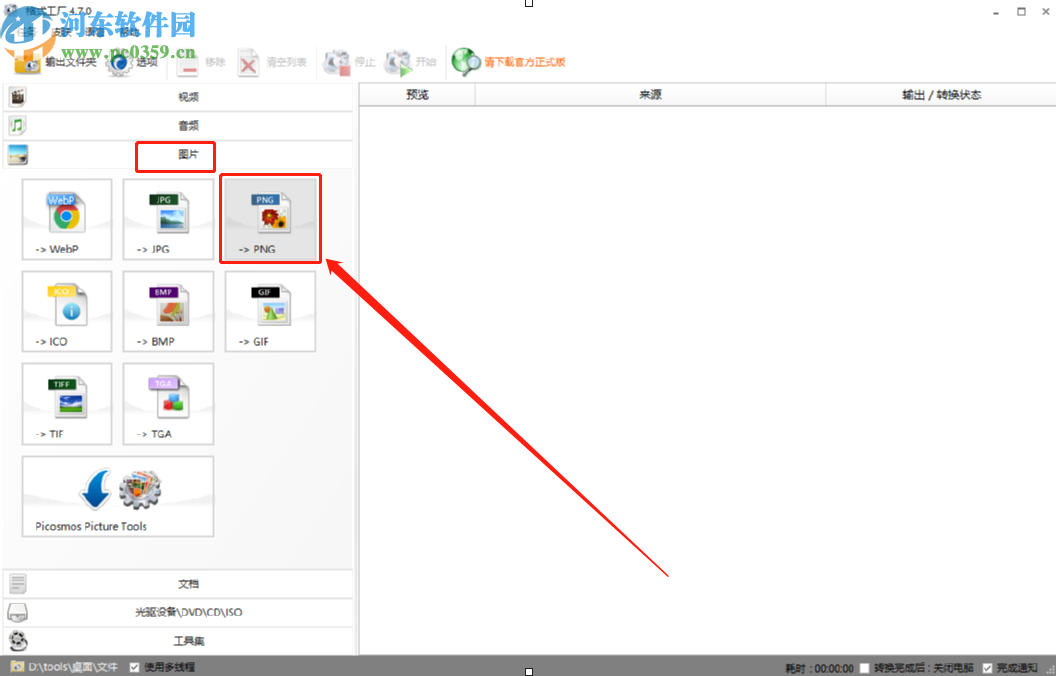 1.首先第一步我们打开软件之后在界面左边点击图片选项,然后在出现的功能中选择png格式。
