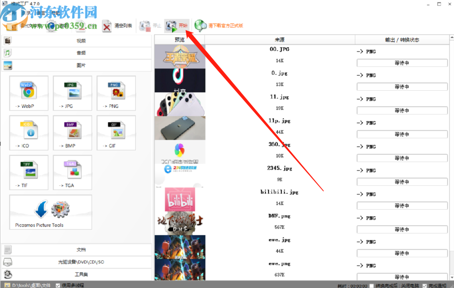 6.点击确定按钮之后回到软件主界面,然后点击界面上方的开始按钮就可以开始批量转换这些图片到png格式了。