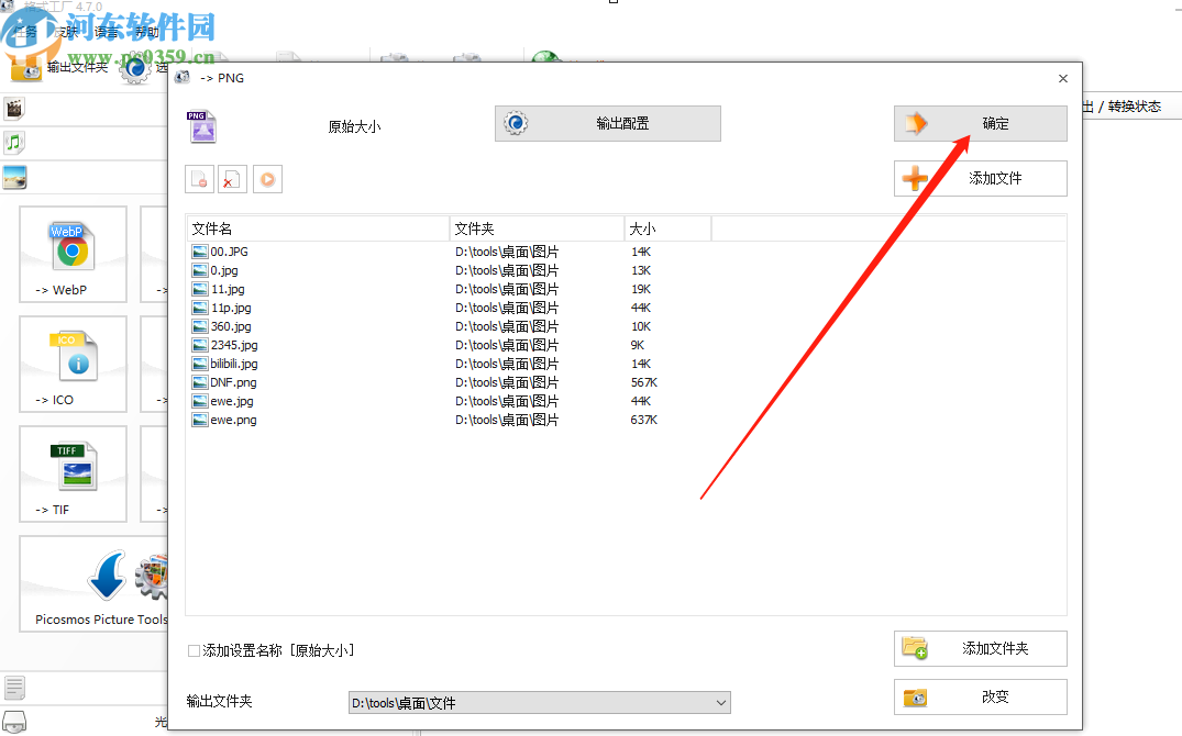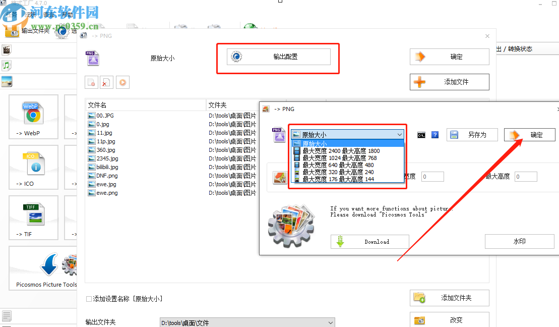 4.点击这个打开按钮之后我们在出现的转换设置界面中,点击输出配置按钮,然后在出现的输出配置界面可以设置图片转换输出的大小。