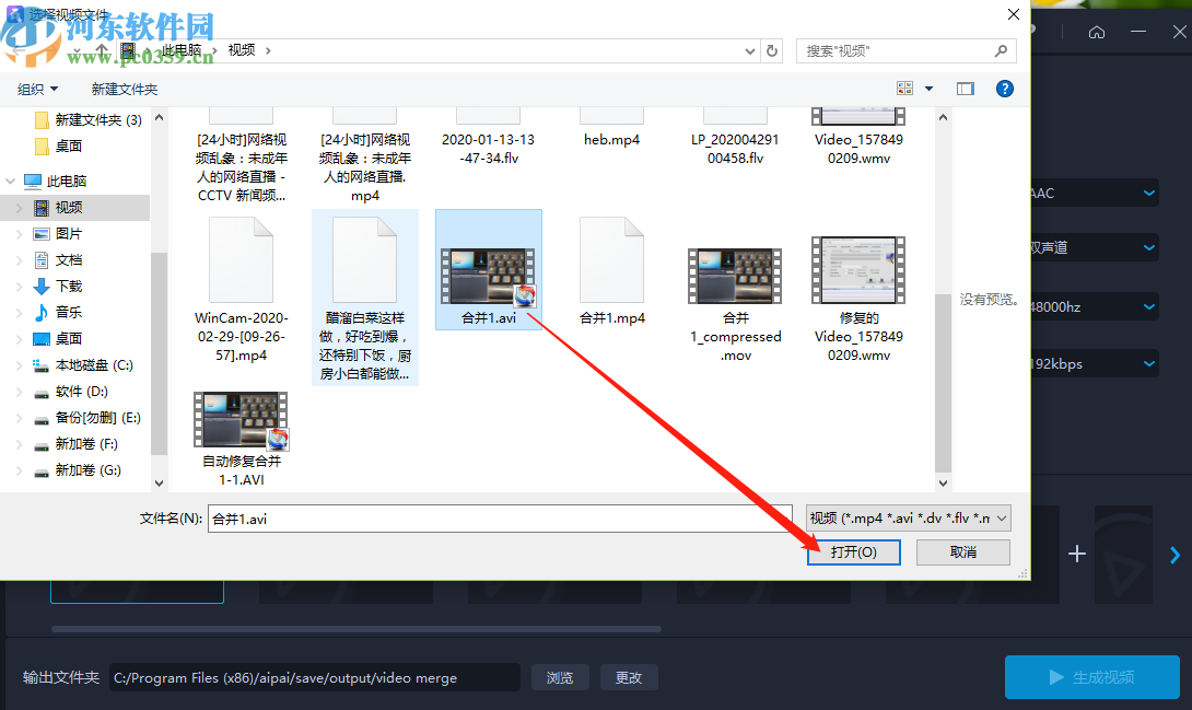 3.点击添加视频按钮之后就会打开一个选择文件的界面,在这个界面中我们选中想要合并的视频之后点击打开按钮。