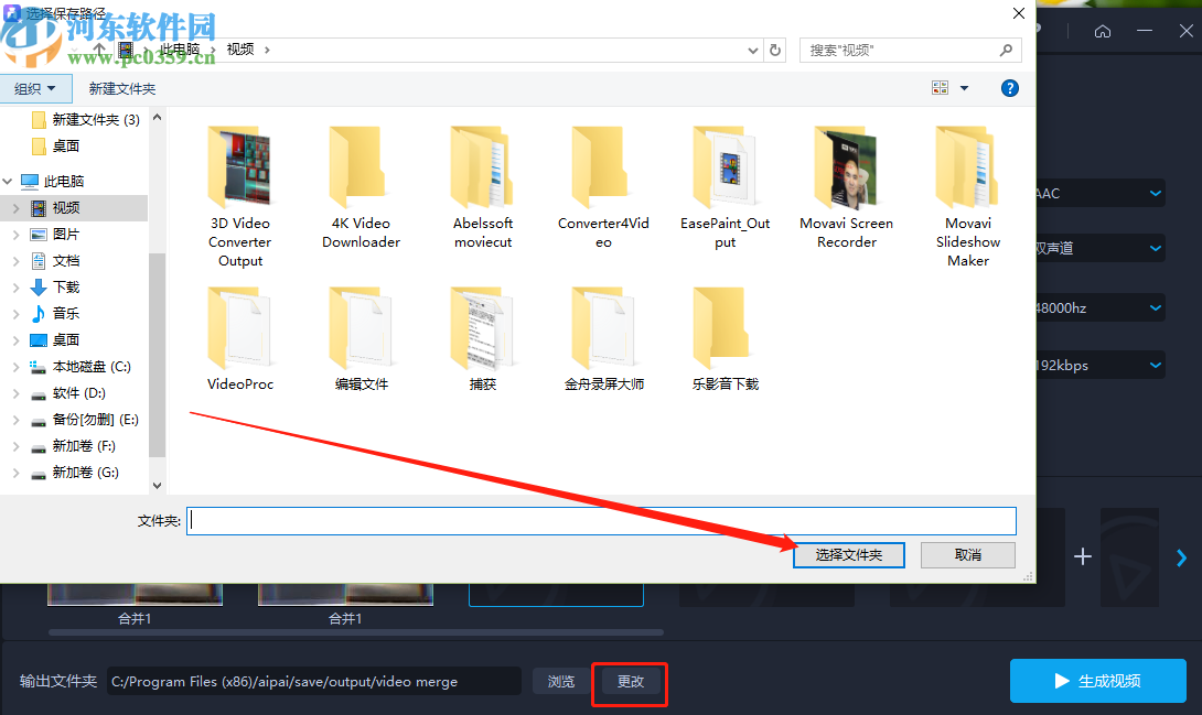 6.根据自己的需求设置好合并视频的输出参数之后,我们点击界面下方的更改按钮我们就可以在出现的界面中选择想要输出保存视频的文件夹了。