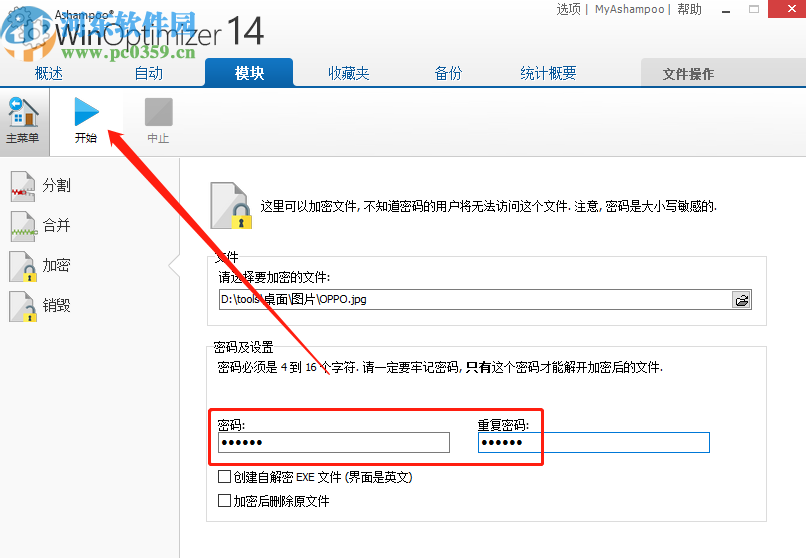 5.点击文件的密码输入完成之后,最后一步我们只需要点击左上方的开始按钮就可以开始加密文件的操作了。