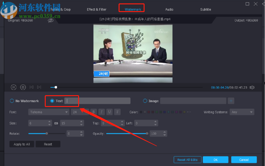 5.选择文字水印之后,在文本框中输入想要设置的水印文字内容,然后在Size这个位置可以手动设置水印文字的大小尺寸设置好之后在视频界面可以预览效果,满意的话点击OK按钮。