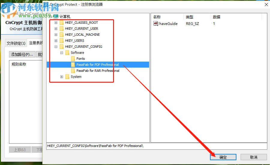 3.点击添加路径之后,进入到注册表浏览器中,我们找到想要锁定的注册表信息,选中之后点击右下角的确定按钮即可。