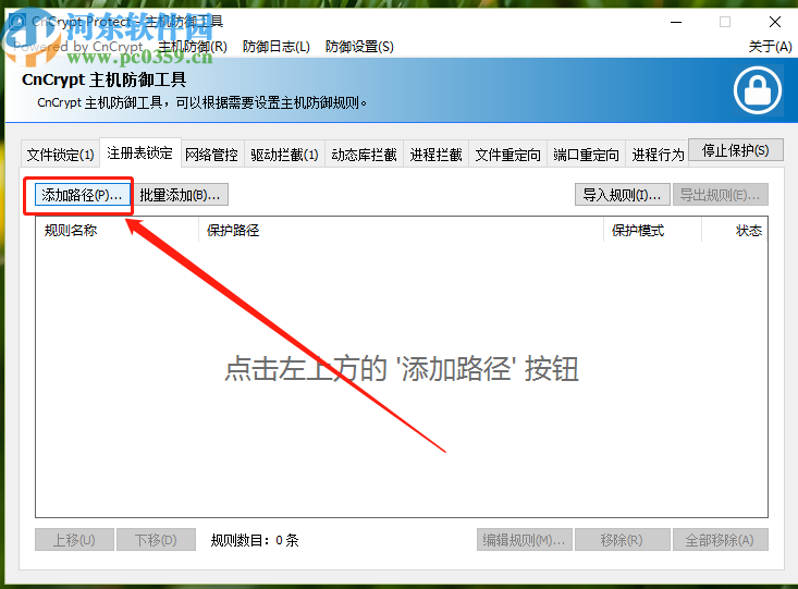 2.启动保护之后,切换到注册表锁定界面,然后点击界面中的添加路径这个功能按钮,点击之后准备添加想要锁定的注册表信息。