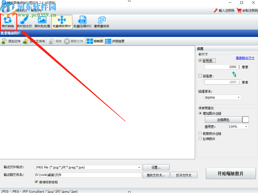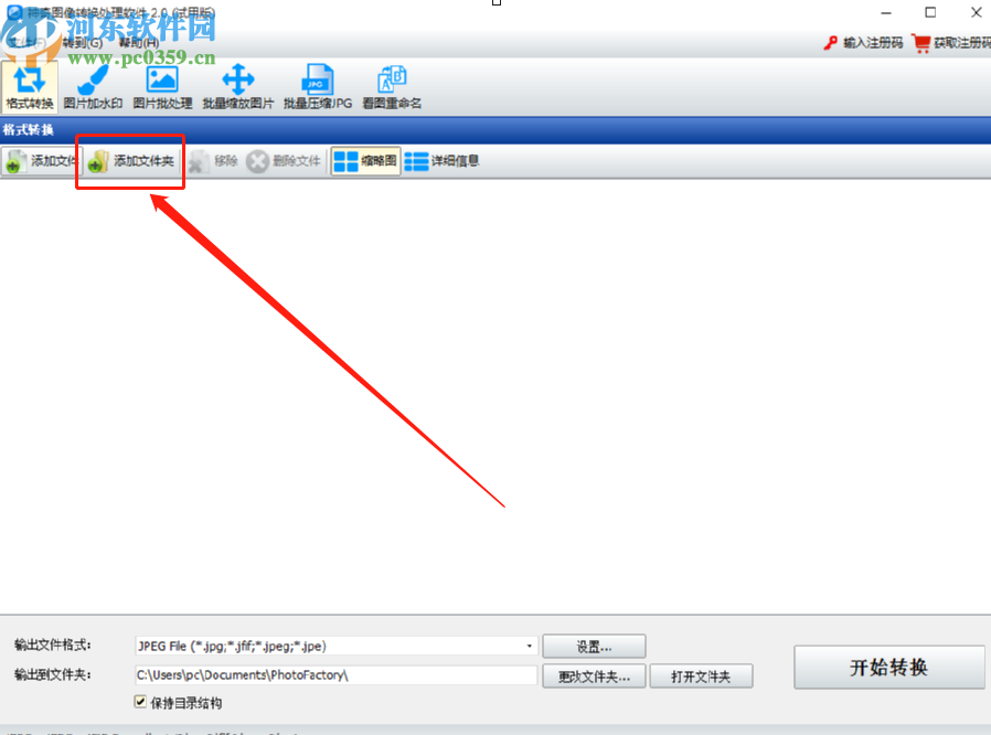 2.点击进入到格式转换功能界面之后,下一步是点击界面中的添加文件夹按钮,点击它准备添加想要处理的图片文件。