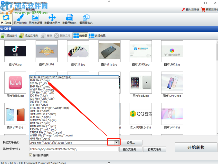 4.点击确定按钮软件就会自动识别在文件夹中的所有图片文件了,接着我们在下方的输出文件格式,打开下拉列表选择想要转换的png格式。