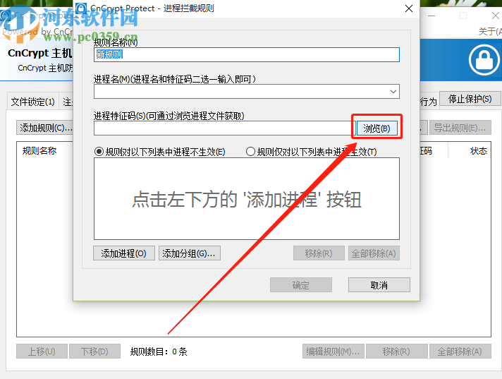 3.点击添加规则之后会出现下图所示的界面,我们点击其中的浏览按钮即可打开选择进程的界面,也可以直接输入进程名称。