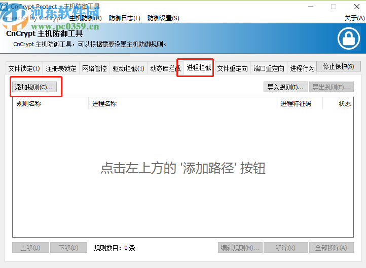 2.启动保护功能之后我们点击进程拦截功能页面,然后点击添加规则按钮,点击这个添加规则按钮之后即可选择想要拦截的进程规则。