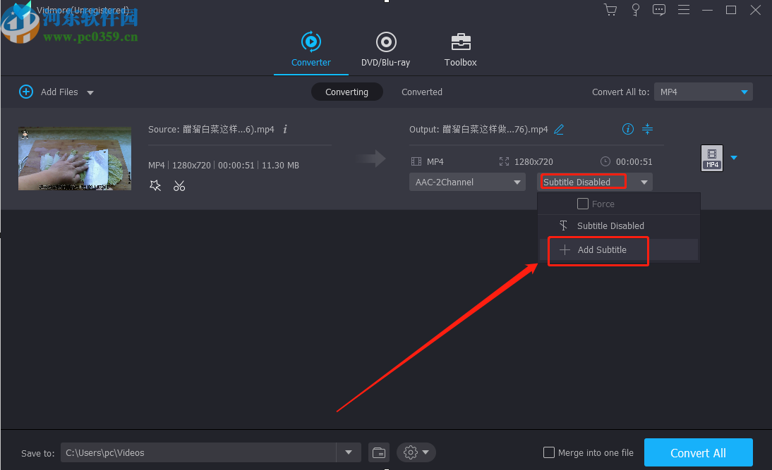 3.点击打开按钮之后我们选择的视频文件就添加到软件中了,然后在界面中点击Subtitle Disabled这个选项,然后选择Add Subtitle添加字幕。
