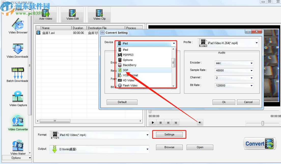 3.点击打开按钮将视频添加到软件界面之后,我们点击界面中的Settings这个设置按钮,打开转换设置界面之后打开下拉列表选择想要转换的3gp视频。
