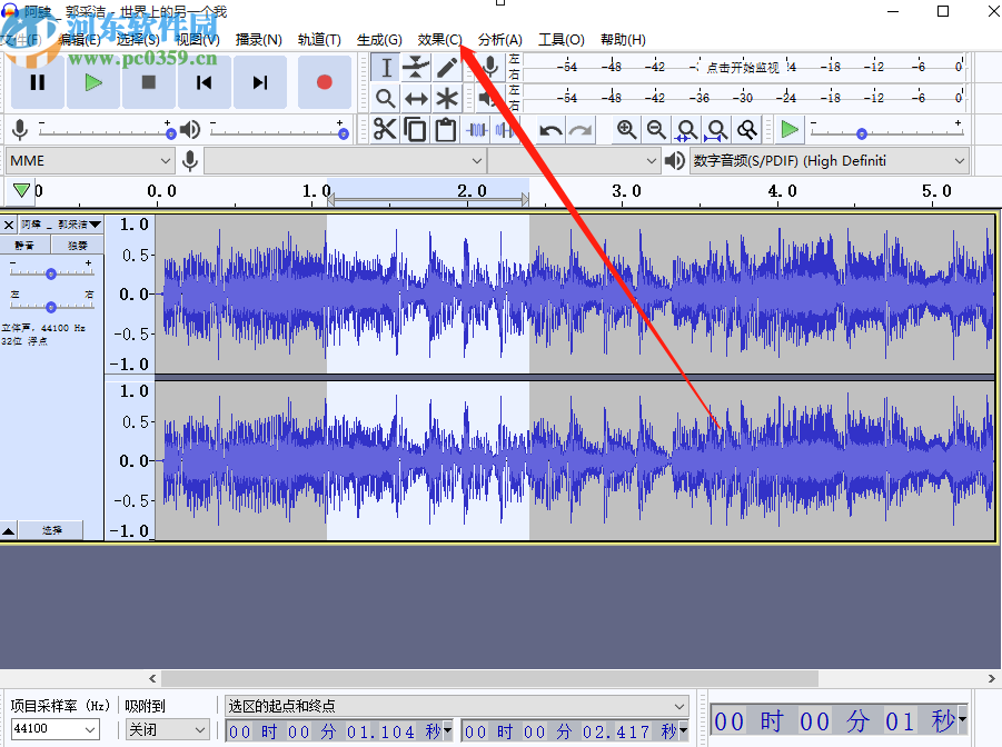 3.点击打开按钮之后我们在出现的音频轨道中,按住鼠标左键拖动来选择想要编辑音效的音频片段,选择之后点击上方的效果选项。