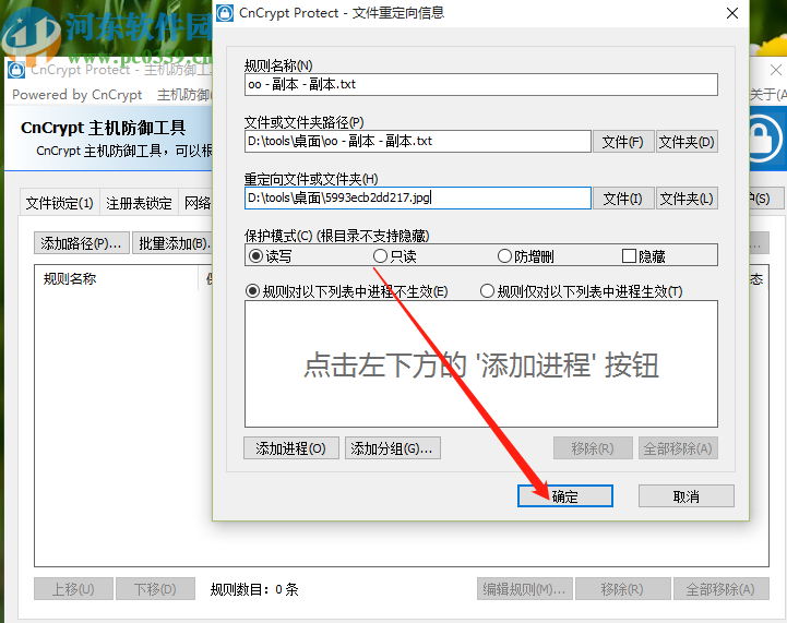 6.点击选择好重定向的文件和重定向文件夹之后,我们选择保护模式,选中之后点击右下角的确定按钮即可创建这个重定向任务。